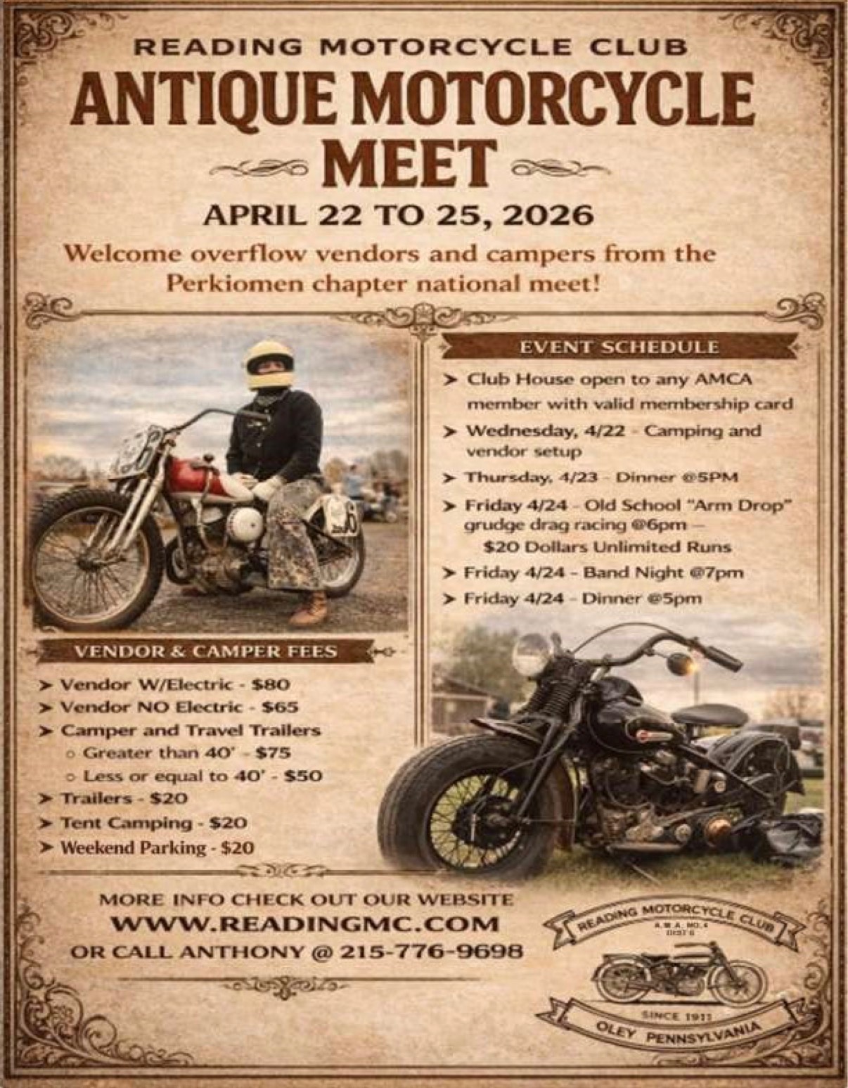 The AMCA weekend is from April 22nd to 25th. For information regarding camping and overflow vendor spots please click on the links below. Should you have any questions please contact Anthony at 215-776-9698 or email aferraro10@comcast.net